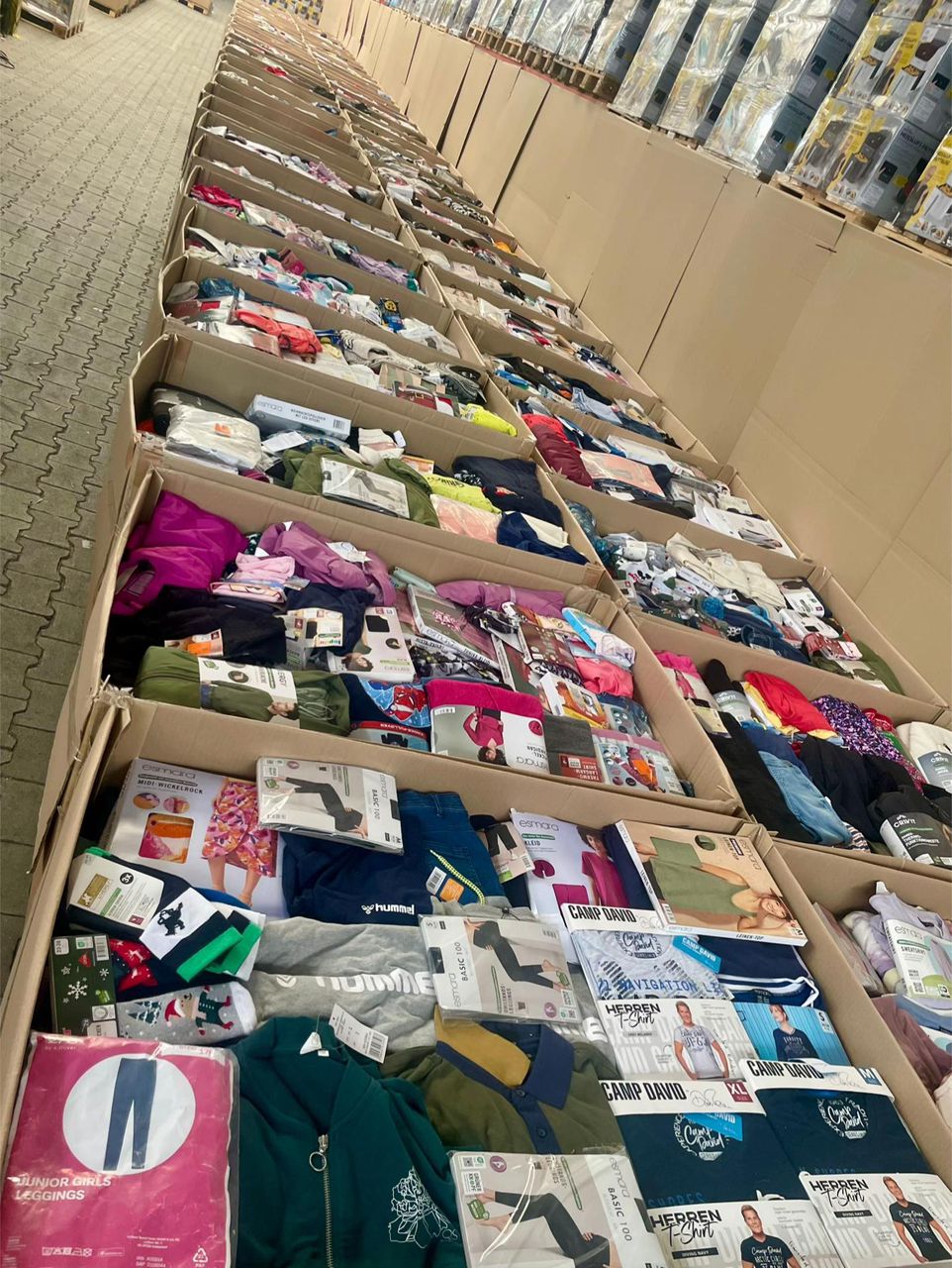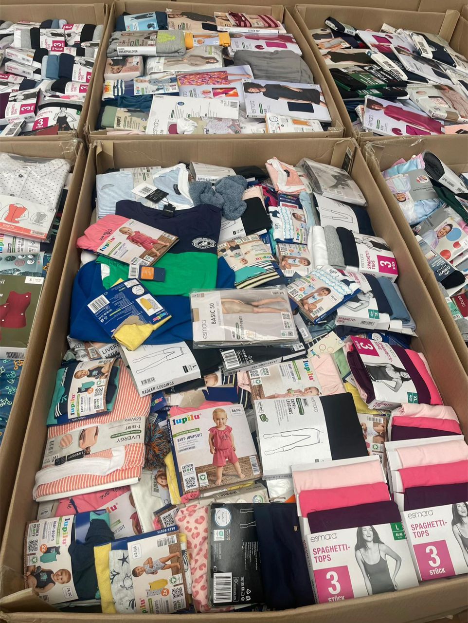 Palette composée d’un large assortiment de vêtements neufs avec étiquettes, idéale pour la revente en ligne ou en boutique.